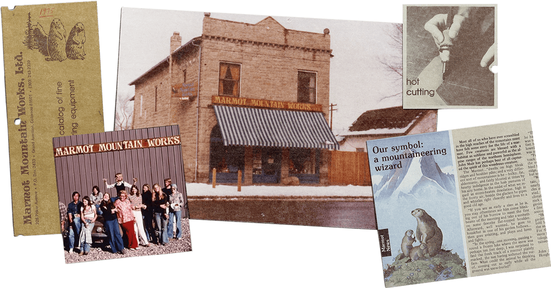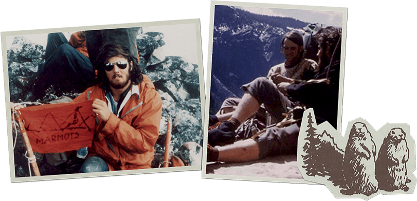 50年を超える私たちの長い冒険は、決して優等生とは言えない3人の若者によって幕を開けました。時は1960年代後半、アメリカではベトナム戦争への反発や社会不安などを背景に自然回帰のムーブメントが勃興。当時、カリフォルニア大学サンタクルーズ校に入学したデイヴィッド・ハントリーもまた強いアウトドア志向の持ち主であり、趣味のクライミングに熱中する生活を送っていました。’71年、この青年は退屈な授業から2ヶ月も逃れられる術としてアラスカでの氷河研究プロジェクトに参加します。そこで出会い、意気投合したのがエリック・レイノルズでした。彼らは調査から戻った後、山岳地帯に生息する社交的なリスの名を冠した登山サークル「マーモット・マウンテン・クラブ」を結成。ヨセミテをはじめとするビッグウォール登攀に何度も赴き、多くの時間をともにします。しかし、ひととおりのウェアやギアを揃える資金はなく、そもそも本当に満足できる製品も見当たらないことから、学生寮の部屋を工房にして自分たちで作ることにしたのです。懇意にしていた地元のアウトドアメーカーに協力を得てデザイン&パターンメイキング、縫製などの基本を学び、友人であったトーマス・ボイスを招き入れ、ベストやジャケット、パーカ、寝袋といったダウンアイテムを製作。これが仲間内で評判となったのを足掛かりに、大学を卒業した ’74年にMarmot Mountain Works社を設立(のちに Marmot へ改称)。アウトドアの盛んなコロラド州へと拠点を移し、工房を併設した最初のショップを開店させました。