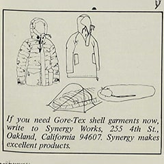 世界で初めてアウトドア用品にゴアテックス素材を採用。試作したスリーピングバッグを食品用の冷凍倉庫に持ち込み、創業メンバー自らが数日間にわたって寝泊まりして性能テストを実施。続く'77年には、同じく世界初となるゴアテックスのダウンジャケットも発売。