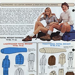 ’76年には、まだ無名に近かったゴアテックスに目をつけて世界で初めてアウトドア用品に採用。寝袋を手始めに、翌年には世界で初めてダウンジャケットにも導入すると爆発的なヒットを呼び、勢いに乗って全米で一番の激戦区であるカリフォルニア州バークレーに2号店をオープンして成功を収めます。’79年になるとメンズサイズを縮小しただけではない、女性の体型に合わせて設計した業界初のウィメンズウェアを発表。さらに ’83年、今では広く根付いているウルトラライト(可能な限り装備を軽量化して登山に挑む)スタイルの源流となった「ライトパッキング」という概念と言葉を先んじて提唱しました。ほかにも、頭の動きに追従して視界を妨げない立体構造のフード、脇下のベンチレーション、手袋を装着したままでも袖口のフィットを調整できるベルクロテープのアジャスター、裾から冷気や粉雪が侵入するのを防ぐパウダースカートなど、のちにアウトドアアウターのスタンダードとなるさまざまなギミックを考案。またMarmotが当時販売していたゴアテックス素材のハードシェルは、’86年よりアメリカ軍に導入された寒冷地向けのレイヤリングシステム、ECWCS の象徴であるゴアテックスパーカのベースになったとされています。こうした数々の実績によって、ハイクオリティかつ機能に特化したメーカーという認知を早い時期から確立、現在にいたる揺るぎないポジションを築いたのです。