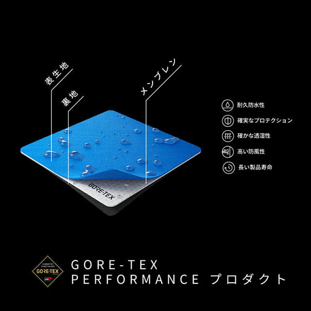 GORE-TEX PERFOMENCEプロダクトは、長い製品寿命を保ちながら、耐久防水性、防風性、透湿性を備え、確実なプロテクションを提供します。またPFCフリーで、カーボンフットプリントが削減されています。